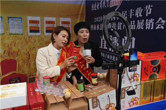 9月22日,兩名“網(wǎng)紅”在商水縣中國(guó)農(nóng)民豐收節(jié)暨商水縣消費(fèi)扶貧產(chǎn)品展銷會(huì)上進(jìn)行直播銷售。近年來,商水縣大力發(fā)展電商扶貧,出臺(tái)政策,幫助農(nóng)民通過網(wǎng)絡(luò)直播等手段把本地的豬蹄、咸鴨蛋、牛肉、變蛋、黑色五谷等特色農(nóng)產(chǎn)品銷往全國(guó)各地,打開農(nóng)產(chǎn)品銷售新渠道,為農(nóng)民脫貧致富奔小康增添新動(dòng)能。
