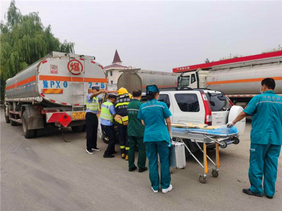 當(dāng)日上午10時(shí),商水交警大隊(duì)指揮中心接到報(bào)警:在商水縣興商大道與陳勝大道交叉口西、湯莊油庫(kù)處,一輛轎車(chē)與一輛?;饭捃?chē)追尾相撞,正常罐體損壞,?;沸孤镀鸹穑I車(chē)駕駛室變形,駕駛?cè)吮焕к?chē)內(nèi),如不及時(shí)救援,駕駛?cè)擞猩kU(xiǎn),另外因事故現(xiàn)場(chǎng)臨近湯莊油庫(kù),如不及時(shí)處置可能發(fā)生爆炸,后果不堪設(shè)想。