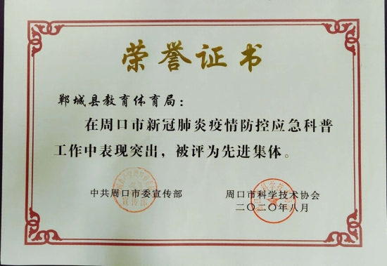 近日,市委宣傳部、市科協(xié)聯(lián)合表彰周口市新冠肺炎疫情防控應(yīng)急科普工作先進集體和先進個人,鄲城縣教體局被表彰為先進單位,縣教體局副局長劉廣鋒被表彰為先進個人,為全縣教育系統(tǒng)疫情防控工作再添光彩。