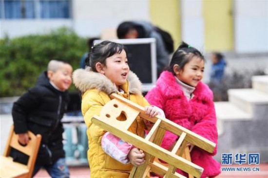重慶市石柱土家族自治縣中益鄉(xiāng)小學(xué)的同學(xué)們搬著小椅子前往操場觀看文藝表演。當日,“我的中國夢——文化進萬家”中國視協(xié)文藝志愿服務(wù)小分隊走進中益鄉(xiāng)小學(xué),為師生們帶來精彩的文藝表演(2019年12月12日攝)。新華社記者王全超 攝