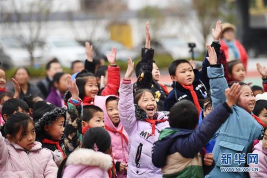 重慶市石柱土家族自治縣中益鄉(xiāng)小學(xué)的同學(xué)們在文藝演出現(xiàn)場與演員互動。當日,“我的中國夢——文化進萬家”中國視協(xié)文藝志愿服務(wù)小分隊走進中益鄉(xiāng)小學(xué),為師生們帶來精彩的文藝表演(2019年12月12日攝)。新華社記者王全超 攝
