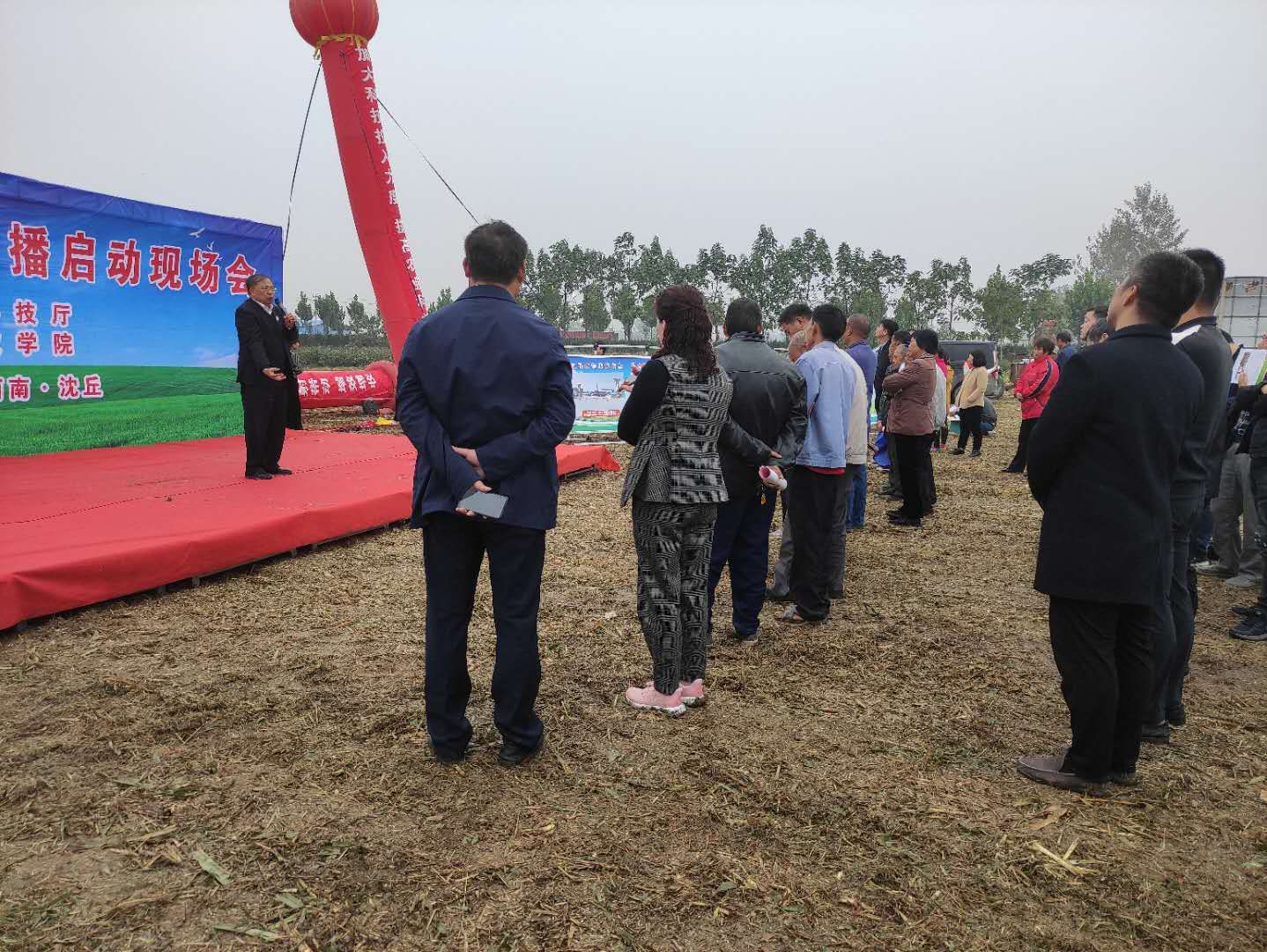 10月13日,沈丘縣周營鎮(zhèn)久酒中梁農(nóng)業(yè)開發(fā)有限公司創(chuàng)建的一處萬畝小麥高產(chǎn)示范方基地,一群農(nóng)民朋友正在深耕整好的麥播地塊,他們一邊探討交流今年的小麥品種選擇、機播下種等相關(guān)技術(shù),一邊翹首等待聆聽河南省小麥產(chǎn)業(yè)科技服務(wù)團的專家教授。這些專家教授深入田間地頭授課,并現(xiàn)場進行小麥播種技術(shù)指導(dǎo)。