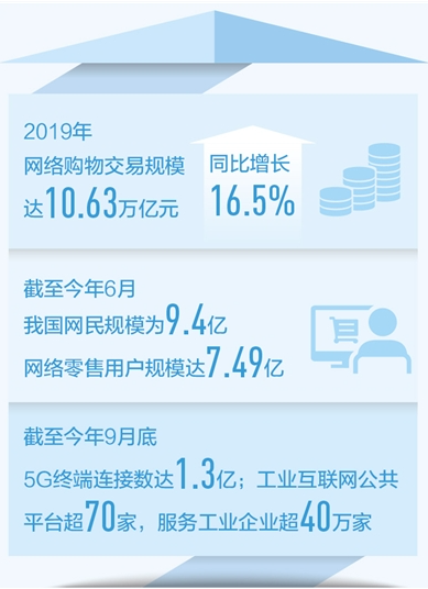 截至2020年6月,我國網(wǎng)民規(guī)模為9.4億,網(wǎng)絡(luò)零售用戶規(guī)模達(dá)7.49億。2019年網(wǎng)絡(luò)購物交易規(guī)模達(dá)10.63萬億元,同比增長16.5%。截至今年9月底,5G終端連接數(shù)達(dá)到1.3億;制造業(yè)數(shù)字化轉(zhuǎn)型穩(wěn)步前進(jìn),工業(yè)互聯(lián)網(wǎng)公共平臺(tái)超過70家,服務(wù)的工業(yè)企業(yè)超過40萬家……如今,數(shù)字經(jīng)濟(jì)蓬勃發(fā)展,成為經(jīng)濟(jì)發(fā)展的新增長點(diǎn),產(chǎn)業(yè)數(shù)字化與數(shù)字產(chǎn)業(yè)化的基礎(chǔ)更加堅(jiān)實(shí),不斷為高質(zhì)量發(fā)展注入新動(dòng)能。