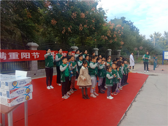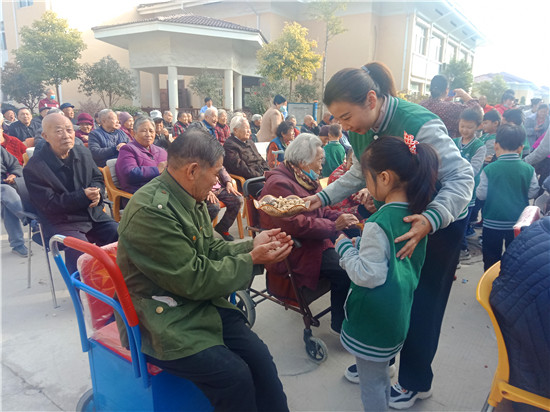 來到周口市老年護(hù)理院之后,學(xué)生們?cè)诶蠋煹挠行蚪M織和家長(zhǎng)們大手牽小手的幫助下,給那里的爺爺奶奶們送去了節(jié)日的祝福。祝愿爺爺奶奶身體健康,生活快樂!同時(shí)為爺爺奶奶表演了自編自導(dǎo)的節(jié)目。孩子們的有趣表演博得老人們開心開懷,并給以陣陣掌聲。