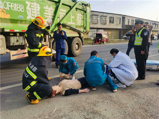 45分鐘的演練,從接警開始到應(yīng)急救援處置,周口市商水縣公安局交警大隊(duì)9名民警和輔警、駐馬店市上蔡縣公安局交警大隊(duì)16名民警和輔警,會(huì)同上蔡消防6名救援人員、4名醫(yī)護(hù)人員和4名車輛拖移人員等,積極協(xié)作,密切配合,將事故中被困車內(nèi)的駕駛?cè)撕褪軅藛T迅速救出并實(shí)施包扎處置,及時(shí)送上急救車迅速前往醫(yī)院搶救。而后,商水縣交警大隊(duì)事故處理民警和上蔡縣交警大隊(duì)民警配合完成事故現(xiàn)場(chǎng)勘查與證據(jù)固定,快速拖移事故車輛,恢復(fù)交通,杜絕了二次事故。