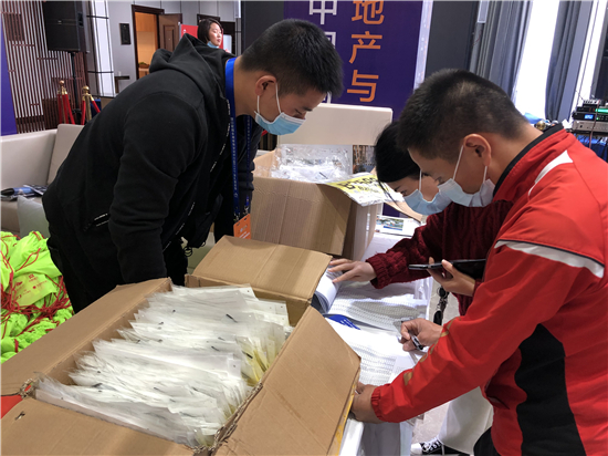 11月12日上午,記者在位于八一大道與文昌大道交叉口的佳利地產(chǎn)營(yíng)銷中心門口看到,今年由于疫情管控的需要,參賽選手領(lǐng)取裝備前需要先展示自己的健康碼,并配合醫(yī)護(hù)人員測(cè)量體溫,進(jìn)入現(xiàn)場(chǎng)還需戴口罩。在一樓活動(dòng)大廳,來(lái)自周口馬拉松協(xié)會(huì)的志愿者們先為選手確認(rèn)身份信息,再根據(jù)選手的身材、體型為其發(fā)放含有不同型號(hào)運(yùn)動(dòng)衣的背包。最終,每個(gè)參賽選手都會(huì)領(lǐng)到一個(gè)熒光綠色的小背包,里面裝有號(hào)碼布、參賽長(zhǎng)袖T恤、存衣包、手套、一次性風(fēng)雨衣和一本官方手冊(cè)等。