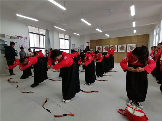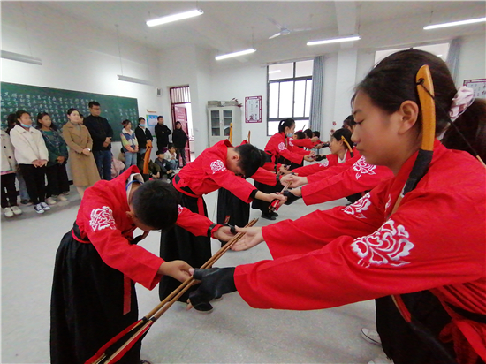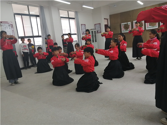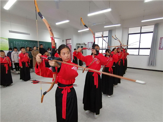 在皮營學(xué)校活動室,學(xué)校舞蹈社團的小朋友展示了傳統(tǒng)儀式《鹿鳴》,深情的演繹,展示了他們對國學(xué)經(jīng)典的理解。禮射是禮樂文明重要組成部分,習(xí)射先習(xí)禮,射以觀德。習(xí)射可以強健體魄,其中還蘊含了眾多古人先賢的智慧。皮營學(xué)校禮射興趣班的小朋友進行禮射表演,隨著挾矢,正筈,審固,舉弓,引彀,發(fā)矢,斂弓,執(zhí)弦等一系列指令,拈弓搭弦展示禮射八法。在這里,學(xué)生們通過不同方式的展示,詮釋自己對“禮”“樂”的理解和認知。