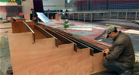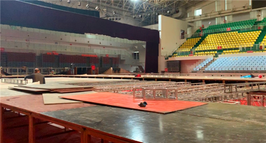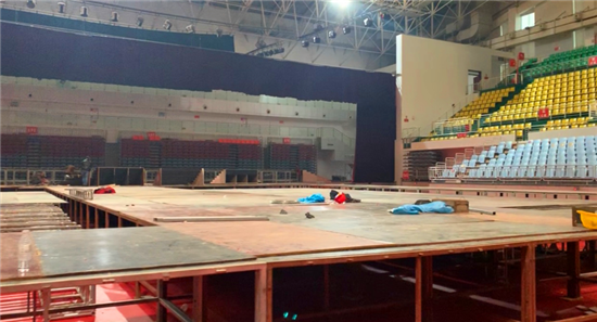 11月23日上午,記者在周口市體育中心看到,由國際名模馬艷麗領(lǐng)銜的周商大會國際時裝表演秀的舞臺正在搭建中。施工工人介紹,時裝表演秀舞臺預計24日搭建完成,搭建完成后將對舞臺進行裝飾。