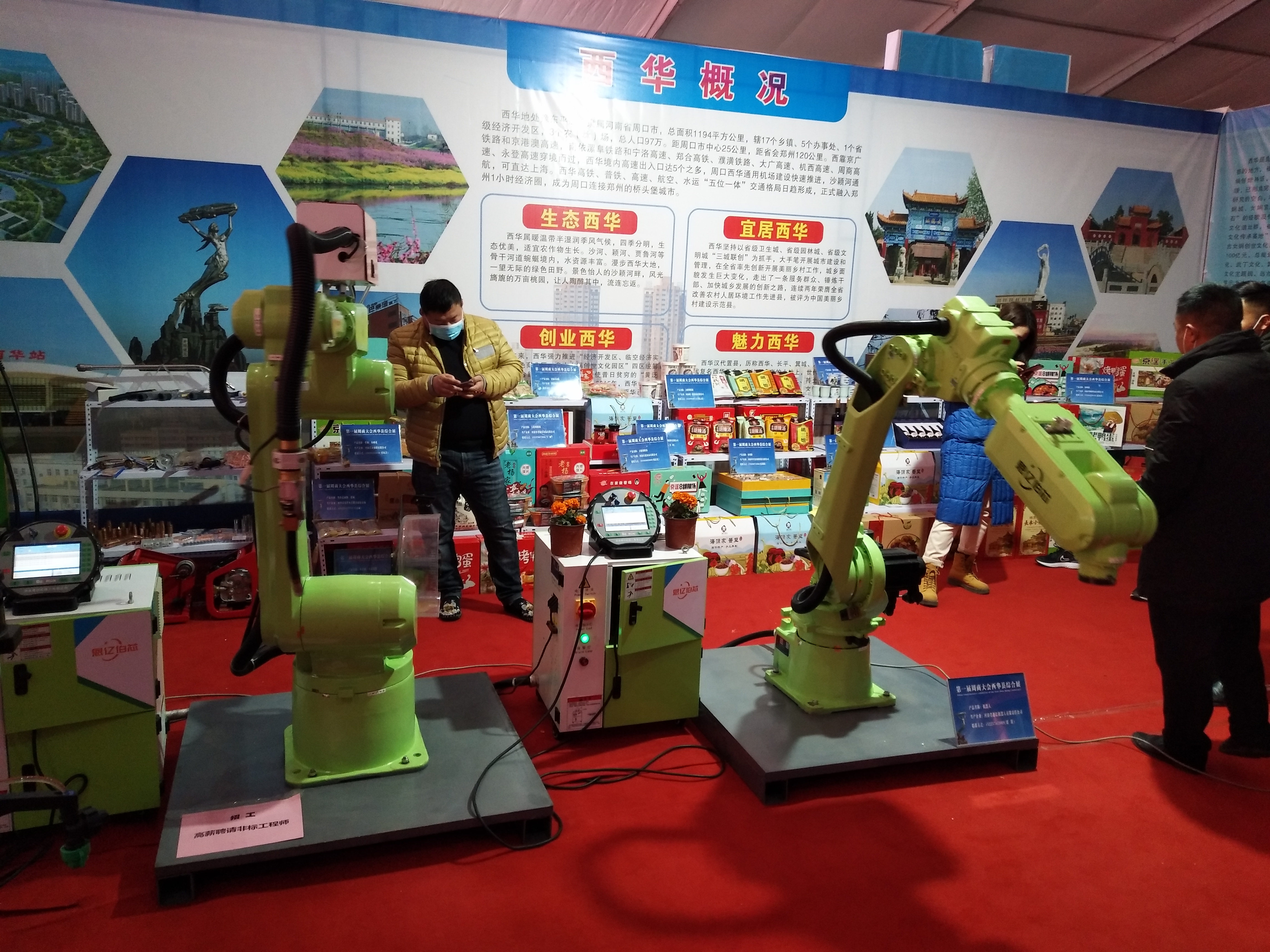 在西華縣展位,兩個高約1.5米、通體綠色的機械手臂,向來參觀的市民揮舞著“手掌”。這兩個機械手臂來自河南省恩億伯芯機器人有限公司,系西華縣本土企業(yè)自主研發(fā)。據(jù)董事長劉濤介紹,展示的機械手臂里,帶防撞器的是焊接汽車等大型機械用的,另一個是碼垛搬運用的,一次能搬運20公斤重的貨物。該廠成立于2014年,與宇通、東風(fēng)日產(chǎn)等大型廠商有深度合作,所研發(fā)的工業(yè)機器人在大理和天津等地均有運用。圍觀市民表示,若不是此次周商產(chǎn)品展示展覽會,還真不知道周口有這些高科技企業(yè),希望周商的科技力量讓更多人看到。②8