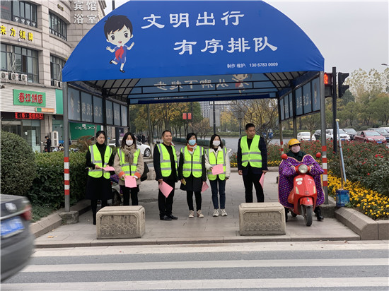 “您好,現(xiàn)在是紅燈,為了安全請等綠燈后再走?!薄罢?jiān)偻笸艘稽c(diǎn),不要擋住汽車通道……”12月5日是第35個(gè)國際志愿者日,當(dāng)日上午8時(shí),正值人流高峰期,在浙江省杭州市富陽區(qū)春江街道大橋路和春南路交叉口,志愿者崔守領(lǐng)一行人身著反光背心在該路口緊張忙碌著,勸導(dǎo)行人文明出行、安全出行,為冬日的杭州增添了一股股暖意。
