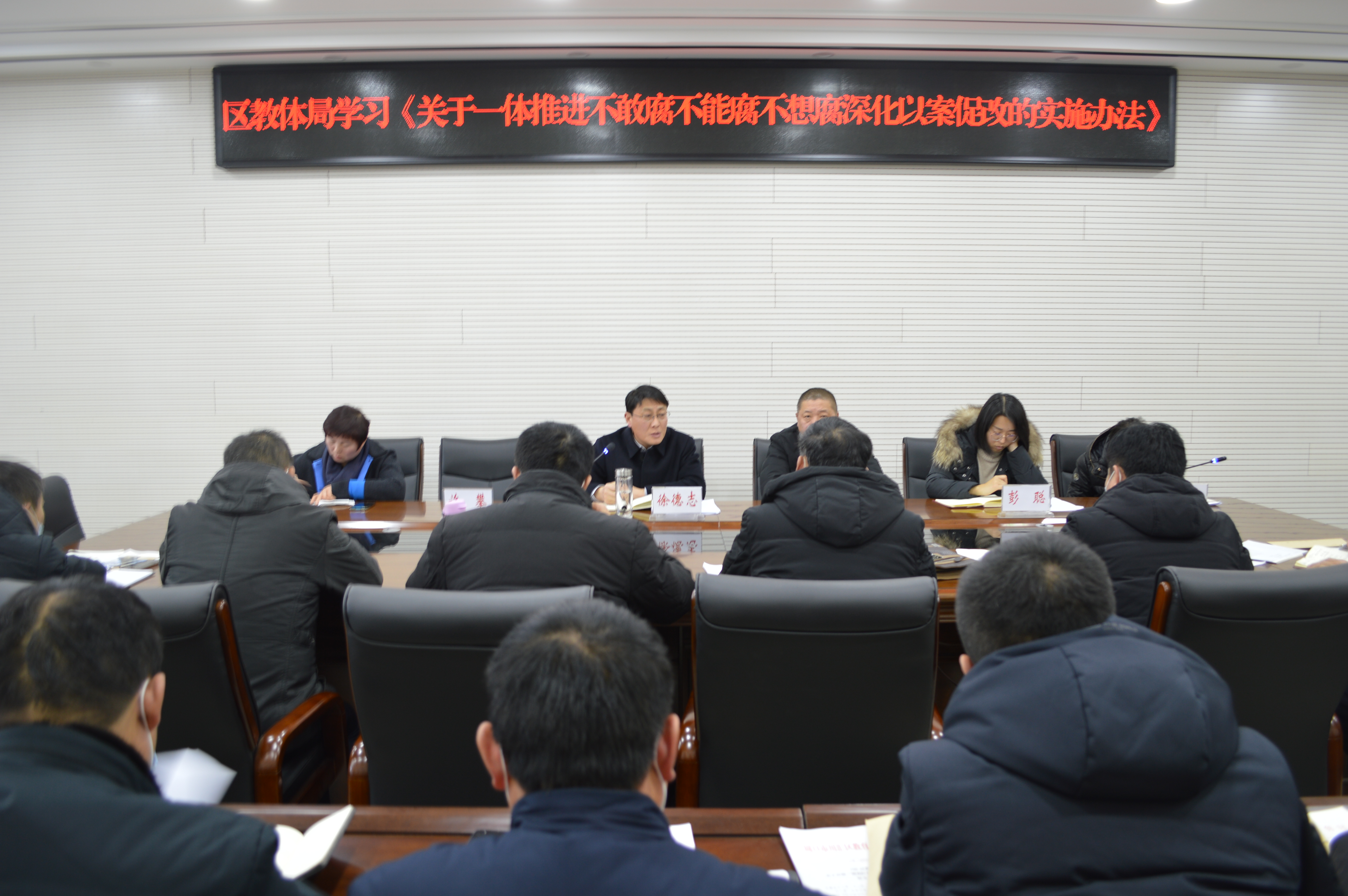 川匯區(qū)教體局黨組書記、局長徐德志強(qiáng)調(diào),要把思想和行動統(tǒng)一到一體推進(jìn)“三不”深化以案促改工作中,通過反思剖析教育體育系統(tǒng)近年來發(fā)生的違紀(jì)違法案件,深入查找風(fēng)險漏洞,強(qiáng)化警示教育,整改突出問題,健全完善制度,促進(jìn)權(quán)力結(jié)構(gòu)配置更加科學(xué)、權(quán)力運(yùn)行更加規(guī)范透明,教育引導(dǎo)黨員干部堅(jiān)定理想信念、增強(qiáng)黨性觀念、提高道德修養(yǎng)、強(qiáng)化紀(jì)律意識,一體推進(jìn)不敢腐不能腐不想腐機(jī)制建設(shè),持續(xù)營造學(xué)的氛圍、嚴(yán)的氛圍、干的氛圍,為推動全區(qū)教育體育事業(yè)高質(zhì)量發(fā)展提供堅(jiān)強(qiáng)的政治保證。