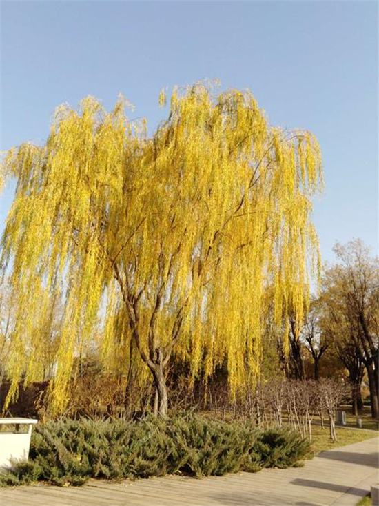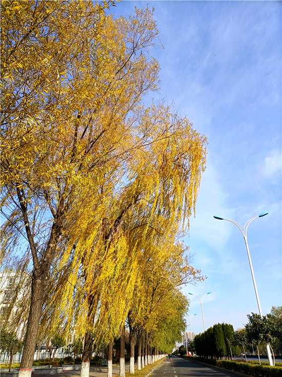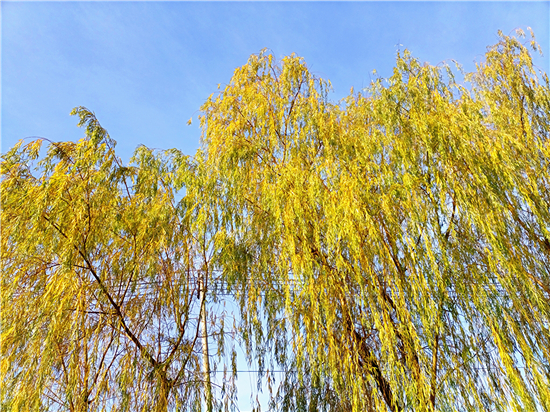 冬日暖陽(yáng)照三川,垂柳更換鵝黃衫。無(wú)盡情思春可寄,千條萬(wàn)條隨風(fēng)翩。12月15日,我市天氣晴朗,路旁一排排垂柳隨風(fēng)搖曳,像一個(gè)個(gè)舞動(dòng)的小精靈,又像一團(tuán)團(tuán)鵝黃色的薄霧,如此美不勝收的風(fēng)景就像一幅畫(huà),令人忍不住駐足欣賞。