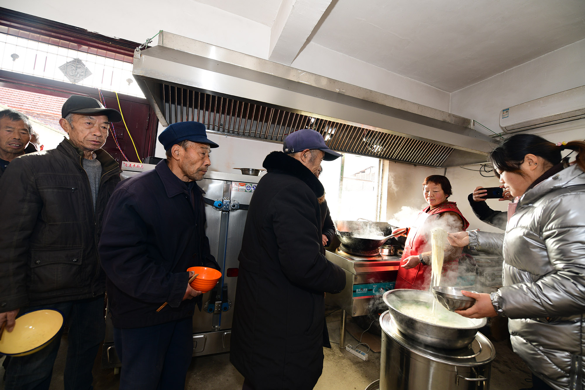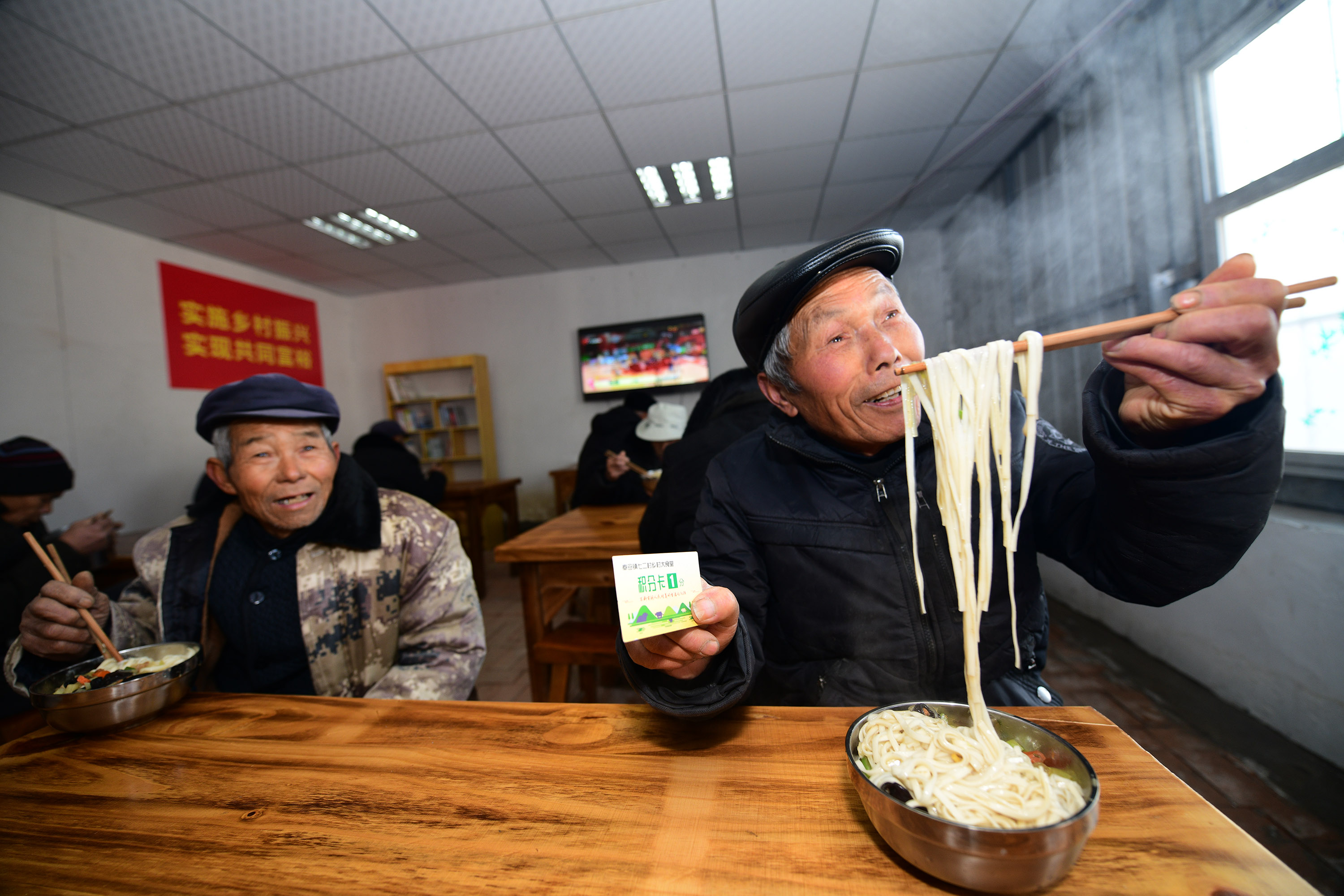 兩個(gè)月前,經(jīng)過籌備,七里倉(cāng)二村的村食堂建成,大鍋飯開伙。食堂設(shè)在一家去世的五保戶家里。村里將房子內(nèi)外粉刷一遍,還買來(lái)了廚具、桌椅。做大鍋飯的是村里的兩名留守婦女。記者于12月15日中午趕來(lái)時(shí),村食堂正開飯,老人們憑票打飯,午飯是臊子面。老人每人端一碗,來(lái)到飯廳就餐。這里有村里裝的電視,大家邊聊天邊吃飯邊看電視,其樂融融。