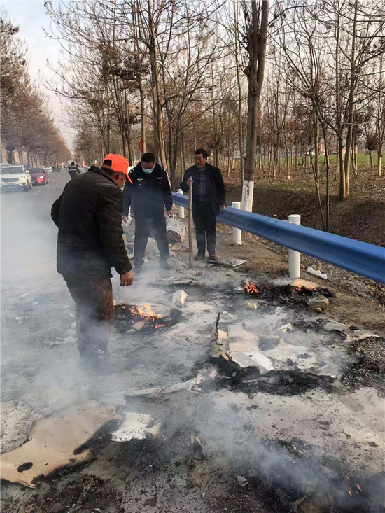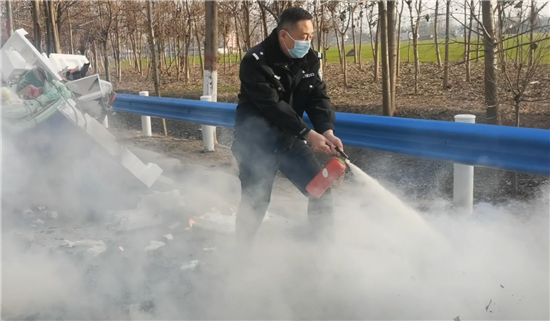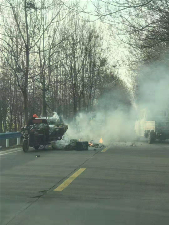 當(dāng)日下午4點(diǎn)左右,太康縣交警大隊(duì)二中隊(duì)指導(dǎo)員南應(yīng)開(kāi)及輔警郭旗全、魯?shù)稀⒁亢勒谮w堂村附近巡邏時(shí),猛然看到前方一輛電動(dòng)三輪車上有煙氣冒出,巡邏民警加速趕到。原來(lái)是一名老漢的一輛拉著廢舊紙箱的電動(dòng)三輪車著了火,一車廢紙和塑料瓶散落一地正在燃燒,火越燒越旺,只見(jiàn)老漢正在手忙腳亂地滅火。這輛三輪車上拉的全是廢塑料、硬紙殼等易燃物,而且當(dāng)時(shí)正刮著風(fēng),如果不及時(shí)滅火任由火勢(shì)蔓延,后果將不堪設(shè)想??吹酱饲闆r后,南應(yīng)開(kāi)迅速?gòu)木嚿夏贸鰷缁鹌髅胱儭跋绬T”,對(duì)著起火的物品進(jìn)行滅火操作,同時(shí)安排輔警對(duì)過(guò)往行人和車輛進(jìn)行疏導(dǎo)。由于發(fā)現(xiàn)和撲救及時(shí),在民警的緊急救援下,火源很快被眾人合力撲滅。對(duì)太康交警面對(duì)火情臨危不亂、果斷處置、幫助群眾的行為,老漢車主和過(guò)往群眾紛紛點(diǎn)贊。②6