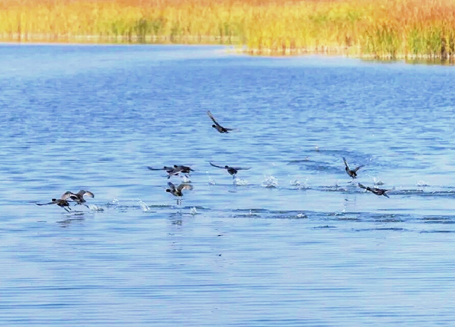 近日,我市天朗氣清、惠風(fēng)和暢,引黃調(diào)蓄工程天藍(lán)水碧、水天一色的風(fēng)景令人心曠神怡,其良好的生態(tài)環(huán)境吸引了很多水鳥前來棲息,如銀鏡一般的湖面上綠頭鴨、赤麻鴨、白鷺、灰鷺等禽鳥成群結(jié)隊,姿態(tài)各異。水鳥、湖水與藍(lán)天交相輝映,風(fēng)光旖旎,盡顯詩意。