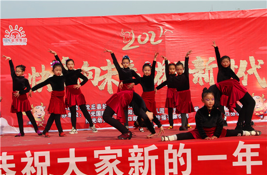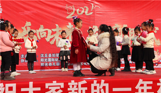 新的一年,新的祝福,新的期待。為迎接2021年元旦的到來(lái),12月25日,沈丘縣婦聯(lián)與沈丘縣陽(yáng)光教育集團(tuán)共同舉辦了以“快樂(lè)向未來(lái),花開(kāi)新時(shí)代”為主題的“熱鬧慶元旦、歡樂(lè)迎新年”慶?;顒?dòng)。