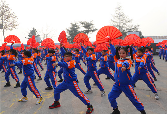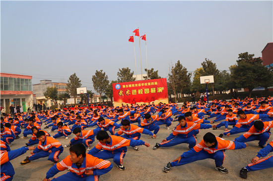 “嘿!哈!”“嘿!哈!”……12月28日,一聲聲鏗鏘有力而又充滿童稚的喊聲,在商水縣譚莊鎮(zhèn)豫東精致雙語學(xué)校上空回蕩。由該校800多名學(xué)生參加的第四屆武術(shù)進(jìn)校園展演活動正在舉行。