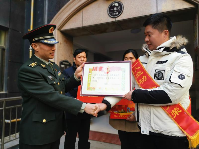 “真是沒想到,現(xiàn)在部隊(duì)還專門將喜報(bào)送到家里,這是我們?nèi)业臉s耀,感謝部隊(duì)為我們培養(yǎng)了這么優(yōu)秀的兒子!”1月12日下午,川匯區(qū)人武部部長(zhǎng)陳繼芳在區(qū)退役軍人事務(wù)局人員的陪同下,來到和諧花園小區(qū)將立功授獎(jiǎng)喜報(bào)送到的現(xiàn)役軍人董波的家里,看到兒子榮立三等功的大紅喜報(bào),董波父母臉上樂開了花。據(jù)悉,當(dāng)天下午共送出4份三等功喜報(bào)。