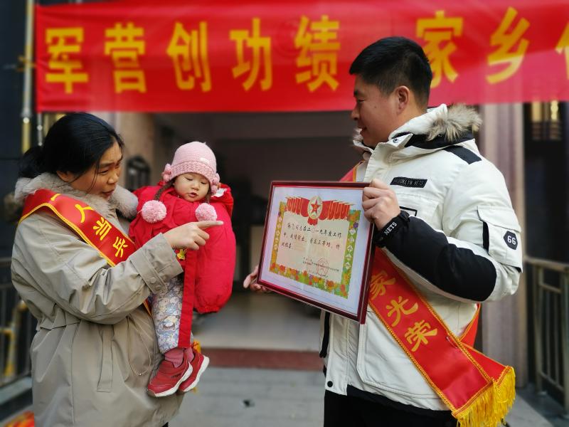 韓飛是武警某部2020年底剛退伍的四期士官,服役期間因表現(xiàn)突出榮立三等功。得知軍地領(lǐng)導(dǎo)送喜報(bào)的消息后,他早早來到小區(qū)門口迎接,韓飛的妻子也特意從單位請(qǐng)假回到家中見證喜報(bào)進(jìn)家門的這一刻。看著家人接過喜報(bào)和獎(jiǎng)?wù)聲r(shí)的喜悅和自豪,韓飛激動(dòng)地說:“雖然已經(jīng)脫下軍裝,但退伍不褪色,以后我一定要更加努力干好本職,不辜負(fù)家人的期盼,不辜負(fù)組織和領(lǐng)導(dǎo)的信任,以更加優(yōu)異的成績(jī)回報(bào)部隊(duì)的培養(yǎng)。”