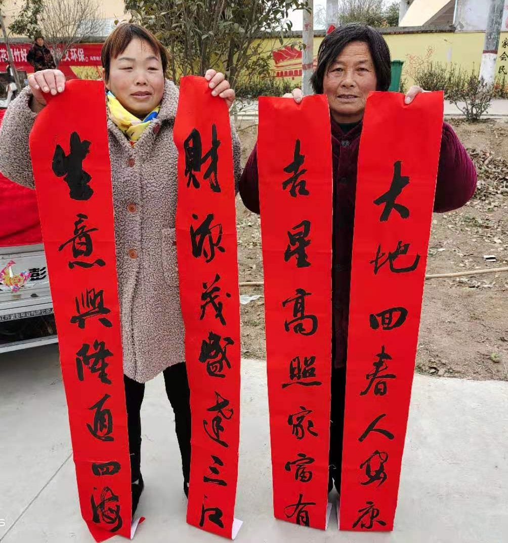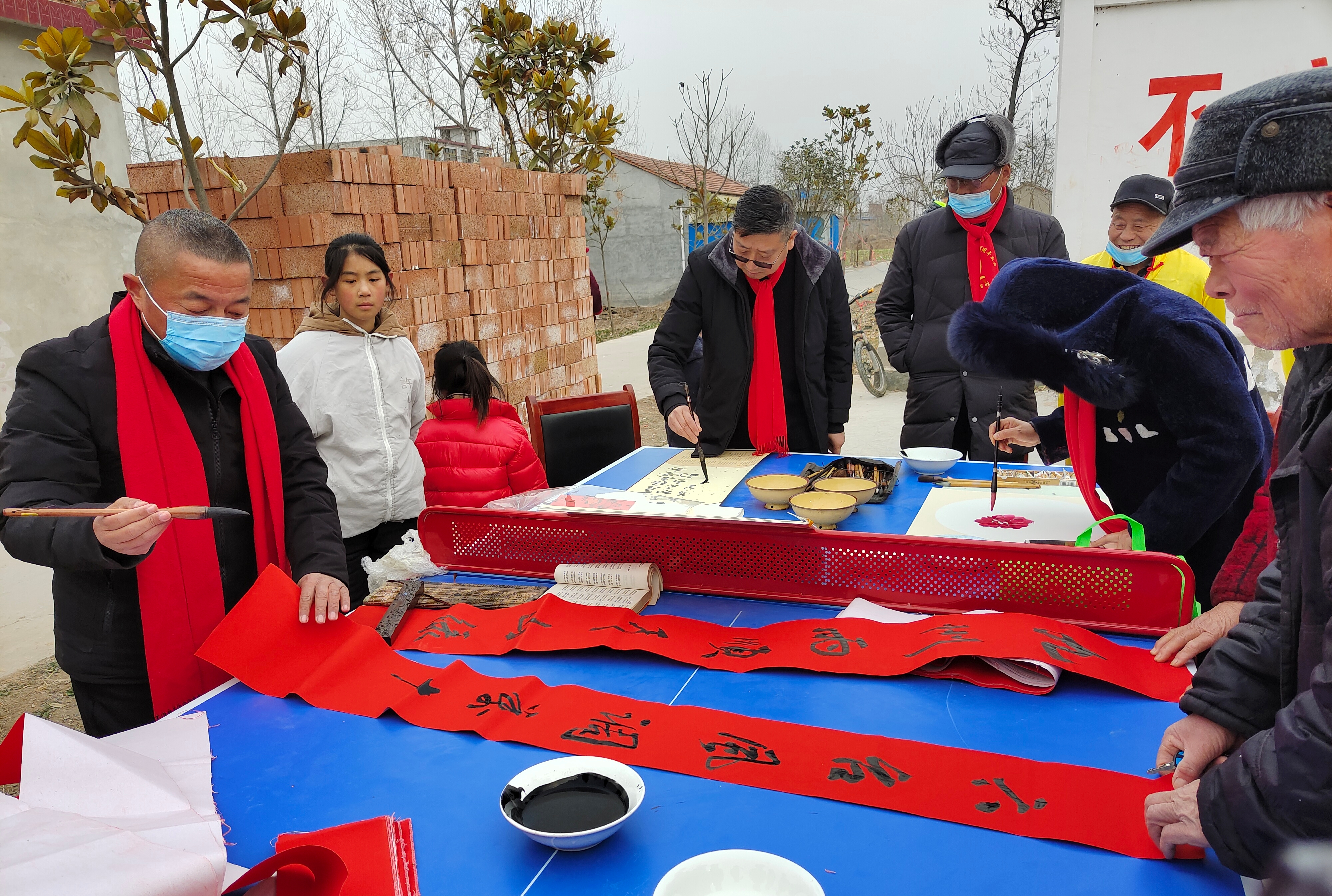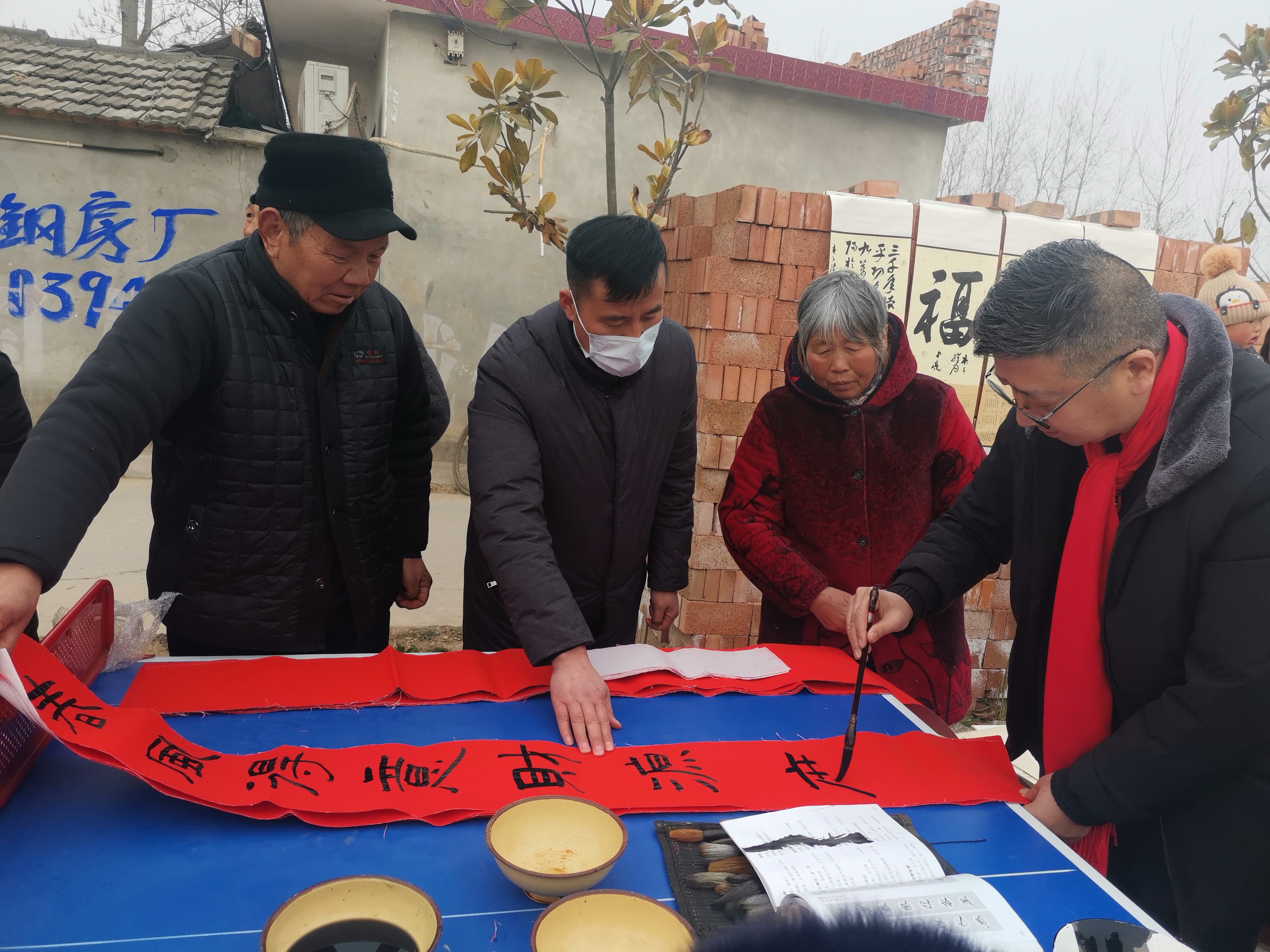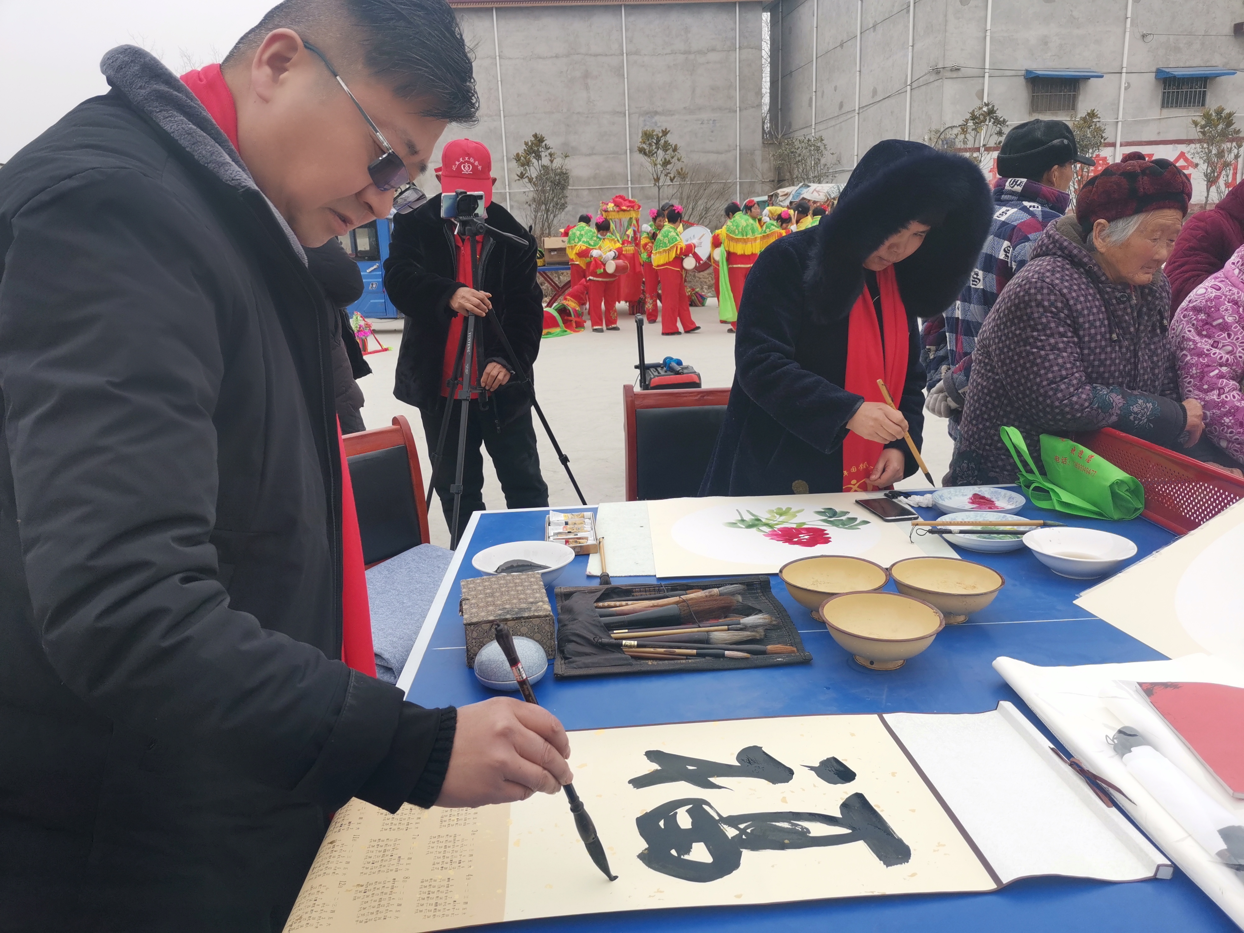 村民們提前得知由沈丘縣國(guó)家文化促進(jìn)會(huì)組織的4名書法家從縣城趕來(lái)寫春聯(lián)送“?!弊郑娂娫缭鐏?lái)到村文化廣場(chǎng),個(gè)個(gè)臉上洋溢著幸福的笑容,就連村上成立的舞蹈隊(duì)也自發(fā)前來(lái)演出助興。