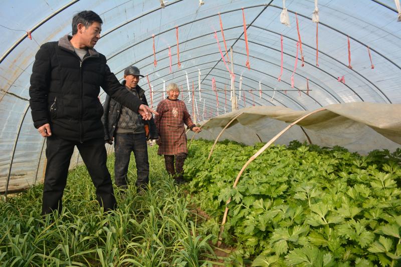 商水縣平店鄉(xiāng)葛樓村70多歲的菜農(nóng)楊志新、朱妮老兩口通過“棚套棚”“ 番茄—芹菜、蒜苗—芫荽”輪作套種,每畝大棚比傳統(tǒng)種法增收5000余元。圖為1月17日,村干部深入田間走訪了解其生產(chǎn)銷售及惠農(nóng)政策享受情況。