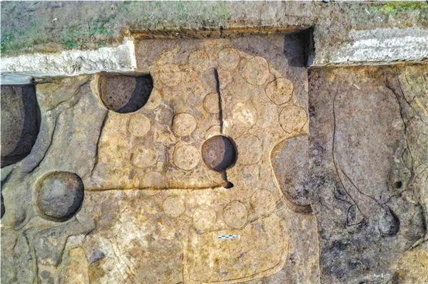 糧倉遺址的南部為人工墊筑的臺地,面積約5600平方米。在臺地上已發(fā)掘的近3000平方米范圍內發(fā)現(xiàn)了29座罕見的倉儲遺跡,分布集中,形制多樣。這些倉儲設施建造時大多先平整墊高地面,然后以土坯建造土墩或墻體,外側涂抹細泥。