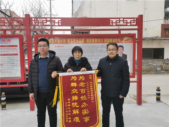 “感謝你馬書記,幫俺解決了低保問題?!苯眨蚯鹂h槐店鎮(zhèn)馮樓社區(qū)居民李秀美將寫有“為群眾排憂解難,為老百姓辦實事”的錦旗送到槐店鎮(zhèn)信訪辦,并連聲致謝。