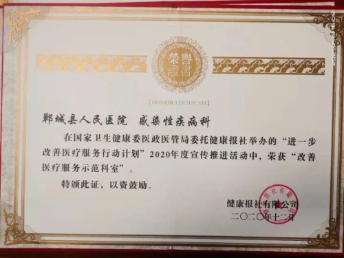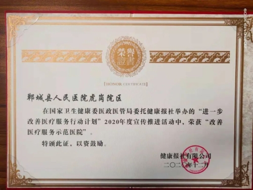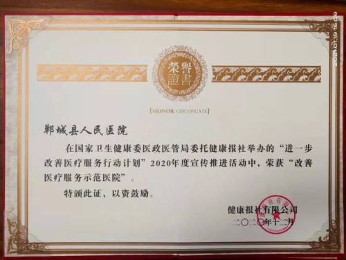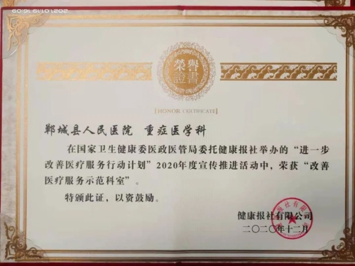 日前,鄲城縣人民醫(yī)院在國(guó)家衛(wèi)健委醫(yī)政醫(yī)管局發(fā)起的“進(jìn)一步改善醫(yī)療服務(wù)行動(dòng)計(jì)劃”活動(dòng)中再獲殊榮,被授予“改善醫(yī)療服務(wù)示范醫(yī)院”榮譽(yù)稱(chēng)號(hào),醫(yī)院重癥醫(yī)學(xué)科、感染性疾病科榮獲“改善醫(yī)療服務(wù)先進(jìn)科室”,集團(tuán)成員單位虎崗鄉(xiāng)衛(wèi)生院榮獲“改善醫(yī)療服務(wù)示范醫(yī)院”。這也是我院連續(xù)第六年被國(guó)家衛(wèi)健委醫(yī)政醫(yī)管局表彰。