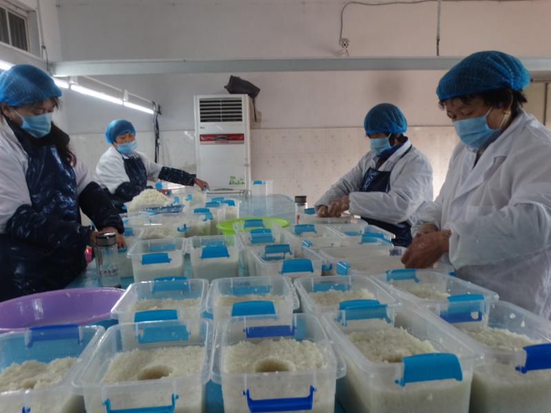 “來這里務工的‘鐵桿工人’,大多都是村上的留守婦女。務工就業(yè)形式很靈活,不誤農(nóng)活,也不影響接送孩子上學,平時有空就來,工資計時或者計件,車間里還安排有4名新脫貧的‘光榮戶’就業(yè)?!蓖趿魪S告訴記者,時至春節(jié),市場需求量很大,有時一天能加工糯米2000公斤左右,工人月均工資都在2000元以上。
