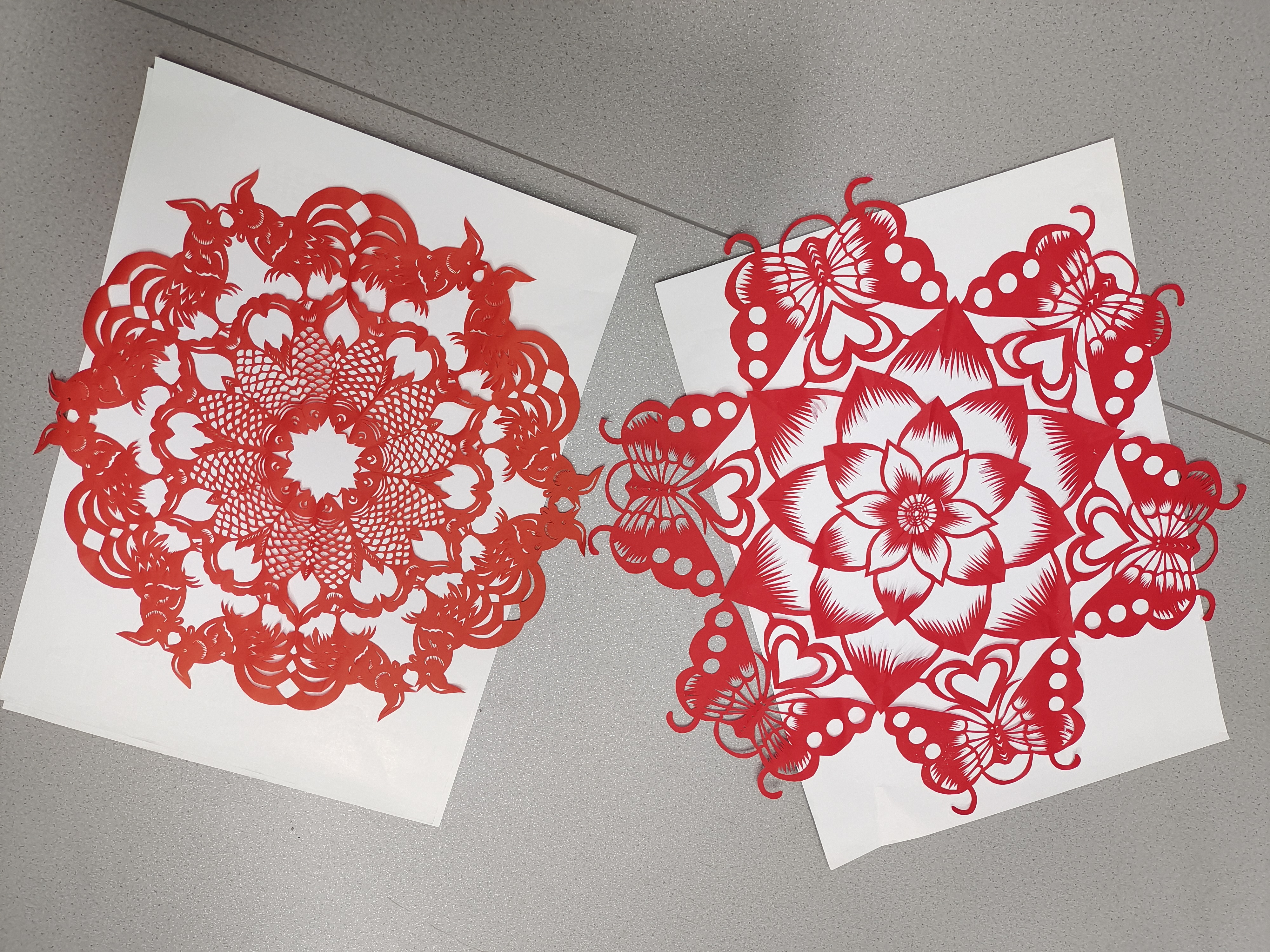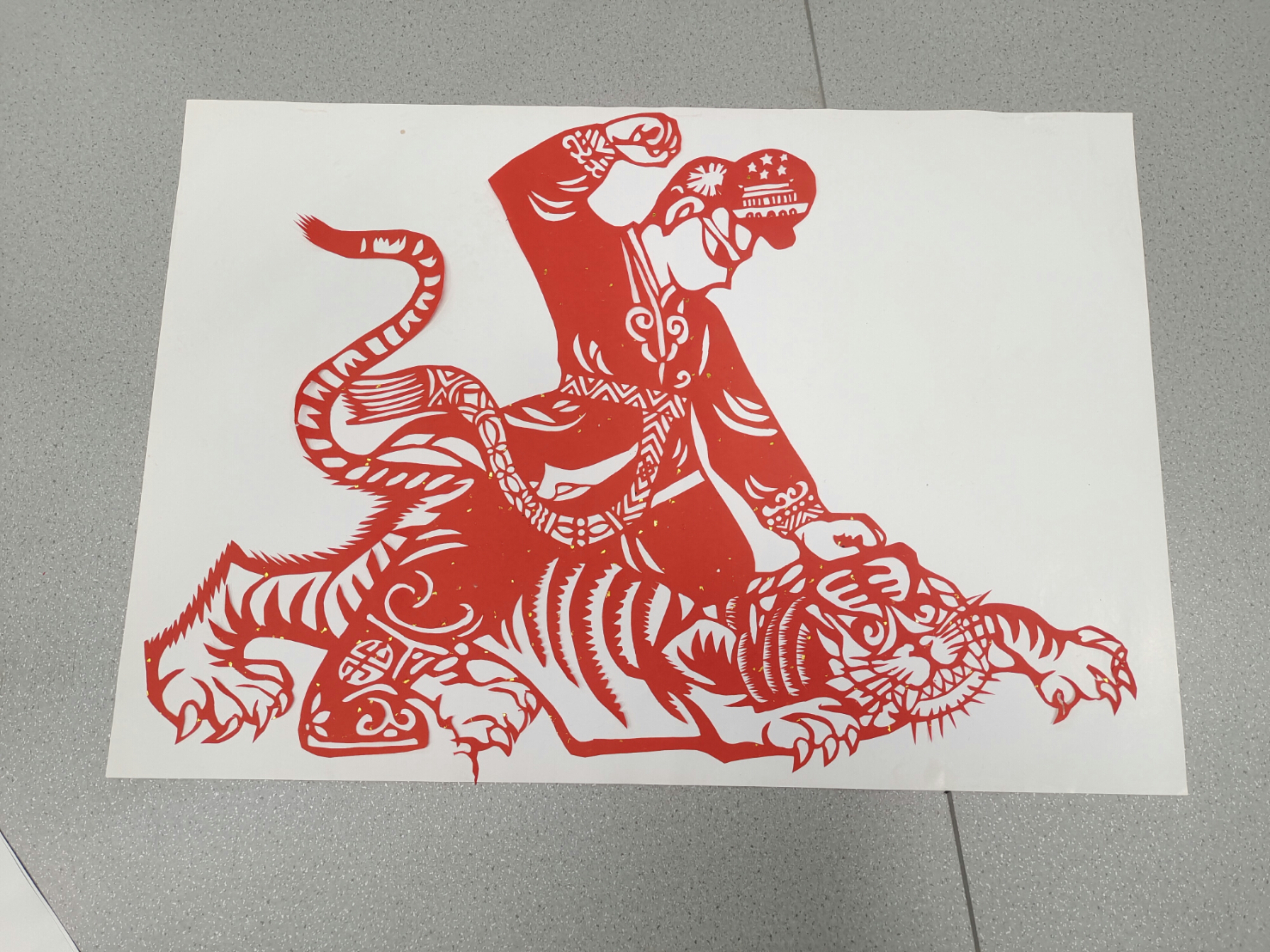 除了“紅雙喜“,王銀生還現(xiàn)場(chǎng)展示了剪窗花,剪蝴蝶,并應(yīng)著即將到來牛年的景剪了耕牛。只見平平常常的紅紙?jiān)谕蹉y生的手中精準(zhǔn)對(duì)折,上下翻飛,一把銀亮的剪刀“嚓嚓”作響,很快就賦予紅紙“生命”,剪出一個(gè)個(gè)生動(dòng)的造型。展示完畢后記者對(duì)王銀生進(jìn)行采訪,探尋他的剪紙之路。