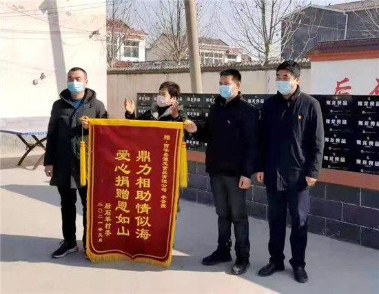西華縣黃橋鄉(xiāng)個私協(xié)分會黨支部書記、西華縣豫龍食品有限公司負(fù)責(zé)人李會霞,帶領(lǐng)該公司員工為黃橋鄉(xiāng)敬老院、后石羊村、奉母鎮(zhèn)七里倉二村鄉(xiāng)村大食堂免費送去米、面、油、豬肉、水餃等慰問品。后石羊村黨支部為其送去了“鼎力相助似海深、愛心捐贈恩如山”的錦旗以示感謝。