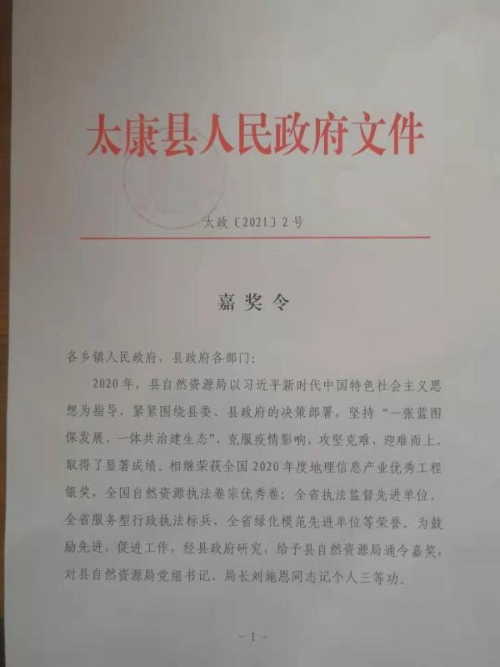 嘉獎令稱,2020年,太康縣自然資源局以習近平新時代中國特色社會主義思想為指導(dǎo),緊緊圍繞縣委、縣政府的決策部署,堅持“一張藍圖保發(fā)展、一體共治建生態(tài)”,克服疫情影響,攻堅克難,迎難而上。相繼榮獲全國地理信息產(chǎn)業(yè)優(yōu)秀工程銀獎、全國執(zhí)法卷宗優(yōu)秀卷;全省執(zhí)法監(jiān)督先進單位、全省服務(wù)型行政執(zhí)法標兵單位、全省綠化模范先進單位等榮譽。