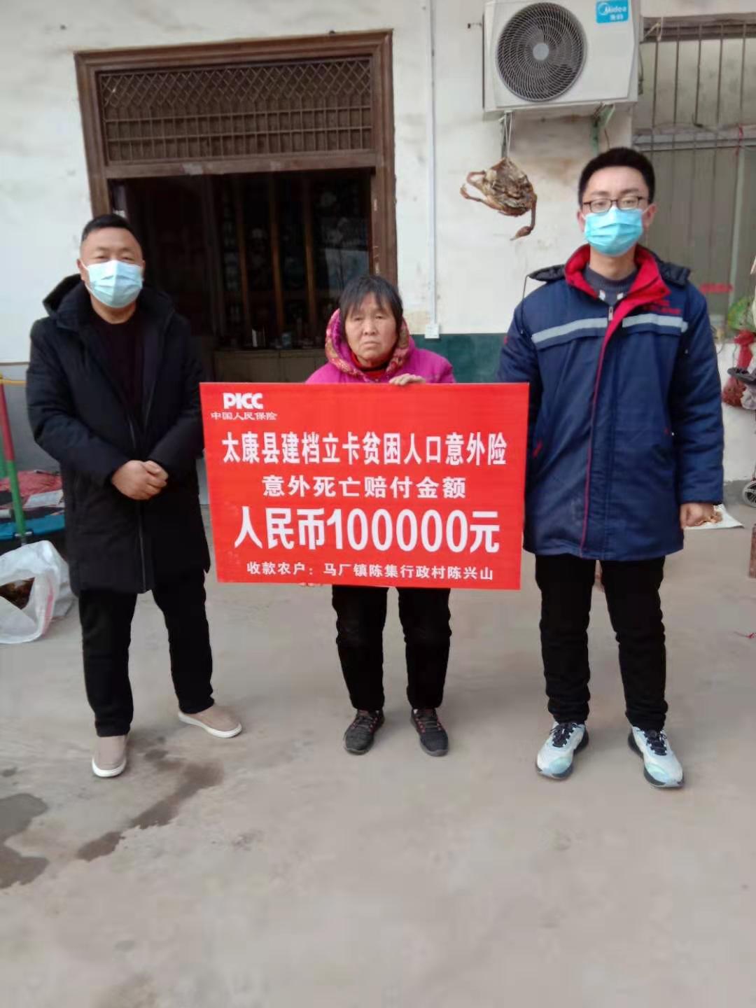 太康人保財險公司接到報案后,第一時間趕赴現(xiàn)場,調查落實情況,幫助陳興山家人準備一切報銷所需材料。針對建檔立卡貧困戶意外傷害保險,太康人保財險公司開通理賠綠色通道,快速高效進行程序審批,把賠付金趕在春節(jié)之前撥付到位。