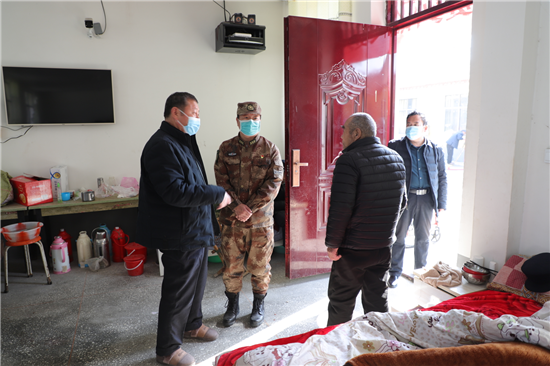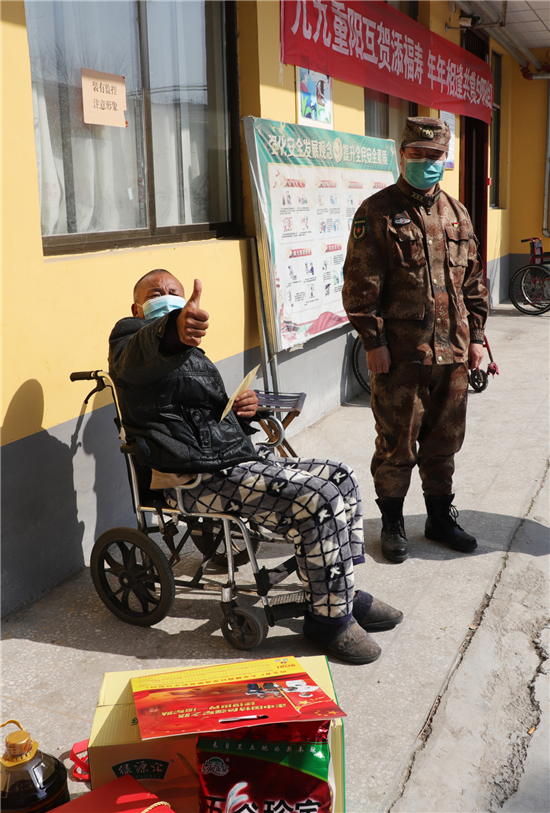 新橋鎮(zhèn)新兵楊凱入伍前和癱瘓的父親相依為命,市人武部領導協(xié)調(diào)地方政府,把其父親送到了新橋鎮(zhèn)敬老院公費養(yǎng)老,解除他的后顧之憂。春節(jié)到了,人武部領導還牽掛著這個特困家庭,矯百成帶隊來到新橋鎮(zhèn)敬老院。此時正值中午,楊凱的父親正坐在屋外的輪椅上曬太陽,見到矯部長的突然到來,激動的眼含熱淚,他緊緊握住矯百成的手久久不愿松開。矯百成噓寒問暖,給他送上1000元慰問金和生活必需品,楊凱的父親用他那不太清晰的語言表達對部長的真誠感謝。在敬老院院長的帶領下,矯百成又來到老人的住室察看起居情況,詢問他平時生活狀況,當?shù)弥先松畹暮苁娣r,矯百成滿意的笑了。
