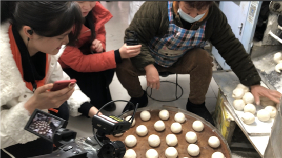 過大年,蒸饅頭。當(dāng)日9時(shí)許,在項(xiàng)城市,兩位主播唱起中國傳統(tǒng)年俗童謠,隨后走進(jìn)一家饅頭店現(xiàn)場直播年饃制作過程。饅頭店老板姓黃,從事饅頭制作30余年,直播開始即見轟鳴的和面機(jī)攪動著巨大的白面團(tuán),黃老板介紹說,這次和的面有130余斤,”以前是人工揉面,一個(gè)壯勞力一次揉40來斤面就不錯(cuò)了?,F(xiàn)在機(jī)器揉面除了揉的多,而且快,還越揉越白,不像人工揉面越揉越黑。機(jī)器揉面越揉越勁道,做出來的饃好吃,我們這兒現(xiàn)在全機(jī)械化制作“。