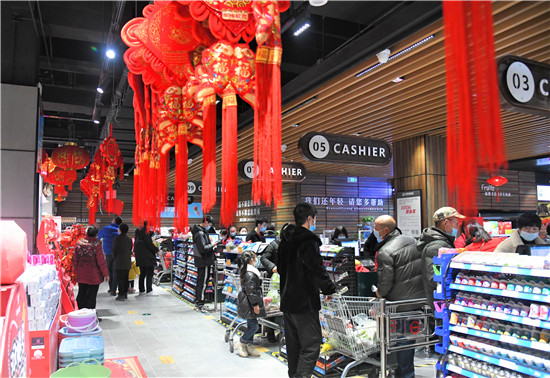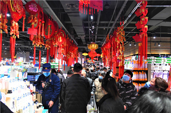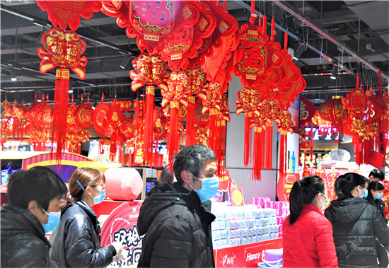 2月9日上午,商水縣行政路一大型超市內(nèi)年貨充足,人流如織,市民自覺佩戴口罩進入商場“掃貨”。
