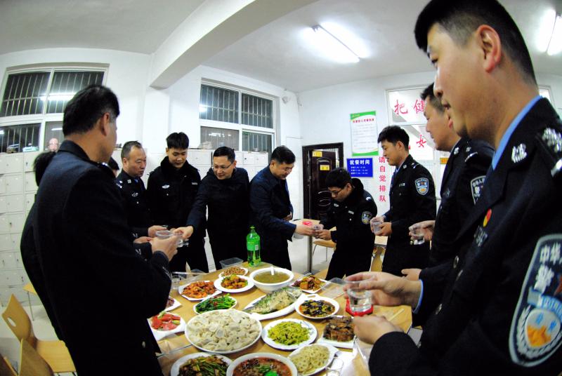 19時30分,在局機關(guān)餐廳,商水縣政府黨組成員、縣公安局黨委書記、局長王之棟,局黨委副書記、政委張俊華與在此值班備勤民警、輔警共度除夕夜。