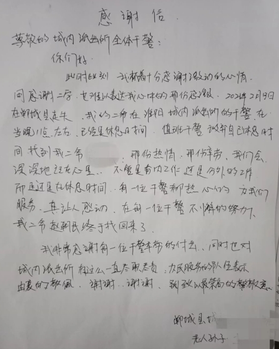 家屬告訴民警,老人去年剛做完手術(shù),身體存在一點問題。民警告知老人家屬今后要看管好老人,謹(jǐn)防走失,并為老人建立易走失人員檔案,以備兄弟單位使用,老人家屬對城內(nèi)派出所表示感謝并寫了一封感謝信。