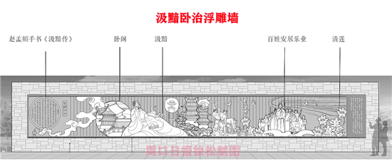 在縣委、縣政府綜合大樓東側(cè)的核心形象段,配合鄲城行政中心打造莊嚴(yán)、大氣氛圍的同時,對鄲城歷史文化進(jìn)行了集中展示,包括鄲城的歷史沿革,鄲城的發(fā)展理念、歷史故事等。其中調(diào)水渠西側(cè)以現(xiàn)有人民廣場對應(yīng)的綠地為基礎(chǔ),設(shè)置了較多的歷史文化節(jié)點(diǎn)。如調(diào)水渠新華路橋頭北側(cè)的廉政文化廣場,講述了漢朝名臣汲黯的故事。汲黯為人耿直,直諫廷諍,親政愛民,敢于承擔(dān)責(zé)任,漢武帝劉徹稱其為“社稷之臣”。汲黯廉政廣場建設(shè)在此處更有著深遠(yuǎn)的意義,它一方面提醒老百姓要了解歷史、敬畏先賢,同時也激勵著鄲城縣的各級黨員干部要在習(xí)近平新時代中國特色社會主義思想引領(lǐng)下,“不忘初心、牢記使命、廉潔奉公、一心為民”。
