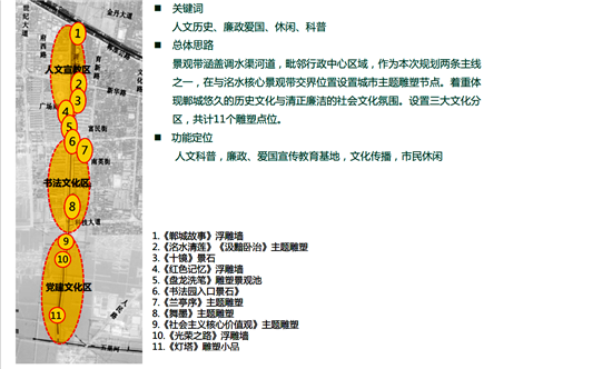 調(diào)水渠景觀在洺河生態(tài)水系“五帶五園一環(huán)多點(diǎn)”景觀中被稱為“人文歷史帶”。全程以“水脈、文脈、人脈”為核心,以“綠色、生態(tài)、休閑、文化”為理念,建設(shè)了“三段銜一園”的景觀結(jié)構(gòu),有鄲淮路至廣場南路的景觀核心形象段、廣場南路以南至科技大道的書法體驗(yàn)段、科技大道以南至五里河的教育文化段和位于交通路與英博路之間的書法生態(tài)休閑園。全段景觀以人文歷史為主題,分別設(shè)置了文化廣場、汲黯廣場、廉政廣場、書林步道、墨香廣場、歷史長廊、書法公園等19處景觀節(jié)點(diǎn)。