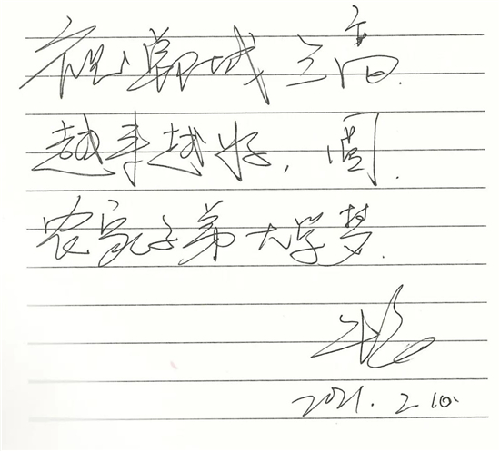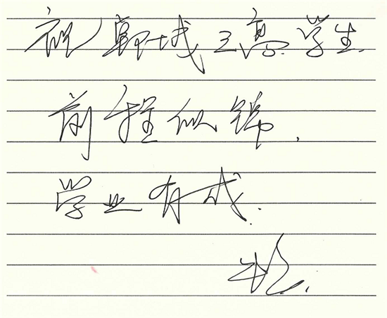 朱婷雖然很少回家,但是一直關(guān)注老家鄲城的發(fā)展變化,特別關(guān)注鄲城的教育發(fā)展,當她得知鄲城三高率先提煉出“孝、勤、韌、忠、濟”為核心的朱婷精神,并把這種精神作為鄲城三高學子的精神引領(lǐng)時非常感動,為鄲城三高始終堅持立德樹人的教育理念而高興,為鄲城三高學子的拼搏進取精神而欣慰,為鄲城三高辦學成果而點贊,并欣然寫下:“ 祝鄲城三高越來越好,圓農(nóng)家子弟大學夢;祝鄲城三高學生前程似錦,學業(yè)有成?!?/p>