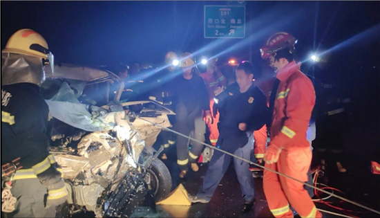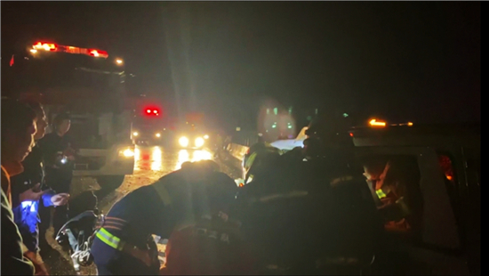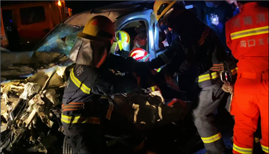 由于面包車內有被困人員,需要消防救援人員到達現場使用專業(yè)破拆工具進行救援。示范區(qū)消防大隊接警后立即調派2部消防車10名指戰(zhàn)員前往現場。指戰(zhàn)員到達現場后利用搶險救援車對事故車輛進行牽引,擴大救援空間以便對被困司機進行施救,同時利用破拆工具將面包車進行破拆便于解救被困小女孩,當晚8時39分,兩人被救出并移交于醫(yī)護人員接受進一步治療。③5