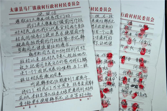 2018年,組織上考慮到韓宇南已經(jīng)在第一書記的崗位上工作了3年多,決定換他回原單位工作。前何村的群眾聽到這個消息后,多次前往馬廠鎮(zhèn)政府請愿,要求留下韓宇南繼續(xù)擔任前河村支部書記,何心功等99位村民還向國家稅務(wù)總局周口市稅務(wù)局、太康縣委縣政府寫了一封“挽留信”,并按下了99個鮮紅的手印。