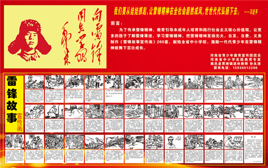 “宣傳展頁(yè)包含了一幅幅生動(dòng)的雷鋒故事宣傳畫,講述了雷鋒從出生到殉職22年的事跡,真實(shí)、樸素、感人。我是唱著學(xué)雷鋒的歌曲長(zhǎng)大的,向下一代人講述雷鋒故事、宣傳雷鋒精神,是我一生的快樂和追求?!睂O永清老師說,隨著年齡的增長(zhǎng),身體方面的原因使他在義務(wù)宣講雷鋒精神方面有些力不從心,所以他希望把雷鋒故事畫成漫畫,制作成宣傳展頁(yè),奉獻(xiàn)給全省中小學(xué)校,讓雷鋒精神永駐校園,“退休前,宣傳雷鋒精神是我的業(yè)余愛好,現(xiàn)在退休了,傳承雷鋒精神就是我的主業(yè),我愿做一顆種子,把雷鋒精神廣播在下一代的心中?!雹?