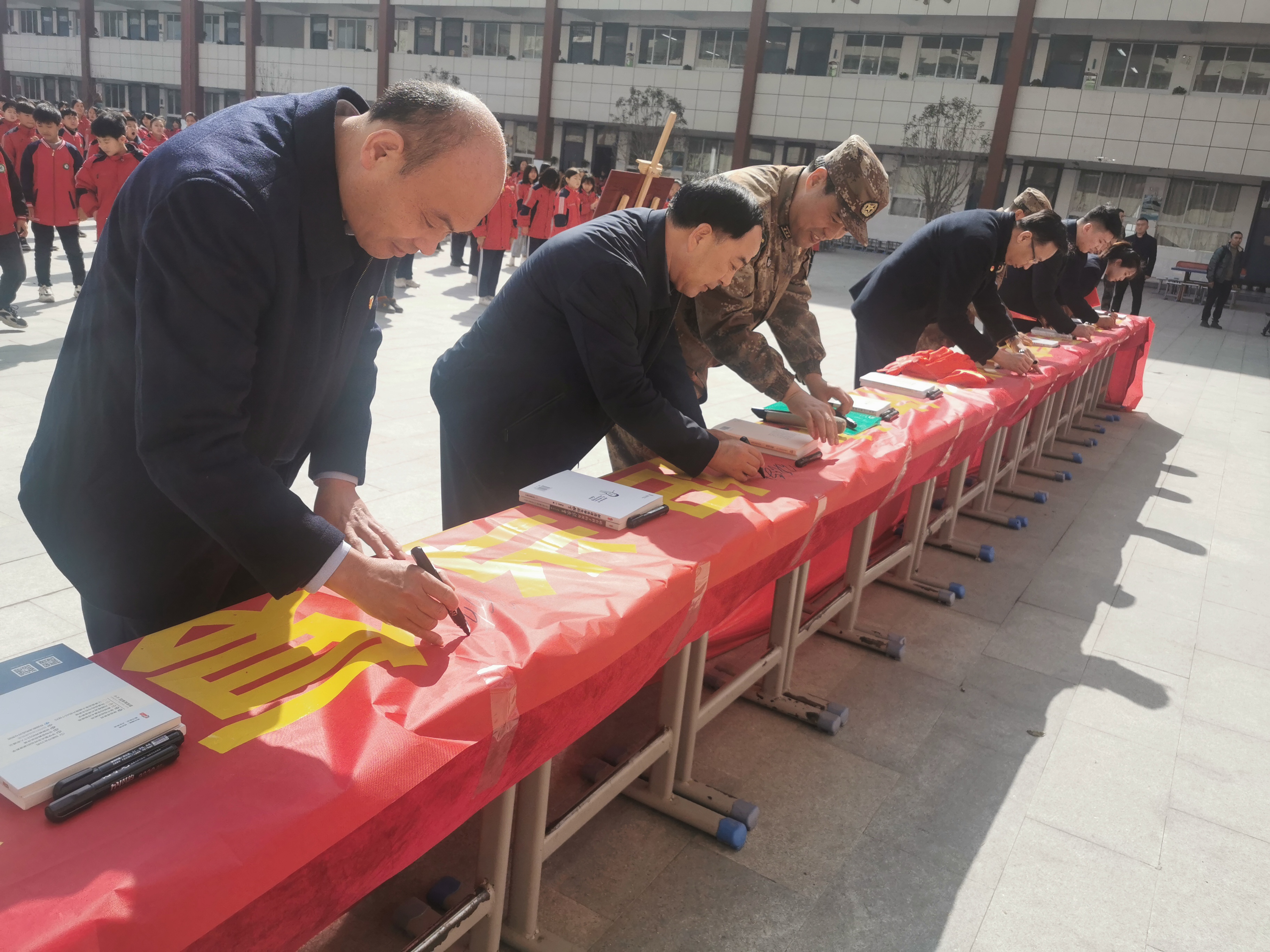 活動(dòng)中,縣領(lǐng)導(dǎo)韓維俊、于永前共同為少年軍校揭牌,并向第六實(shí)驗(yàn)學(xué)校贈(zèng)送英模畫(huà)像。最后參加儀式的領(lǐng)導(dǎo)和廣大師生一起進(jìn)行了“傳承紅色基因、賡續(xù)優(yōu)良傳統(tǒng)、擔(dān)當(dāng)復(fù)興重任”主題簽名。