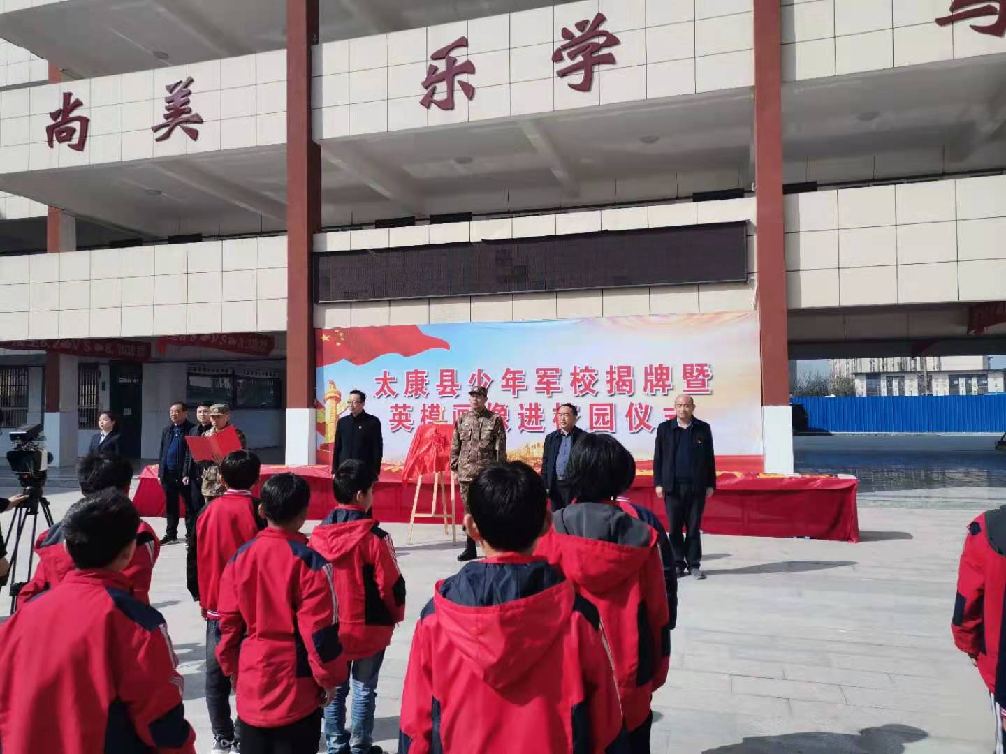為深入開(kāi)展國(guó)防教育,推進(jìn)全縣雙擁工作,3月3日上午,太康縣少年軍校揭牌暨英模畫(huà)像進(jìn)校園儀式在縣第六實(shí)驗(yàn)學(xué)校隆重舉行。太康縣縣委常委、副縣長(zhǎng)韓維俊,縣委常委、縣人武部部長(zhǎng)于永前,縣人武部政委郭立君,縣教體局黨組書(shū)記張俊峰,縣退役軍人事務(wù)局局長(zhǎng)潘布道,團(tuán)縣委副書(shū)記王曉東及縣第六實(shí)驗(yàn)學(xué)校全體師生等參加儀式。