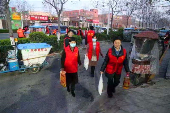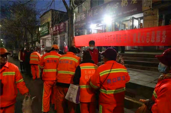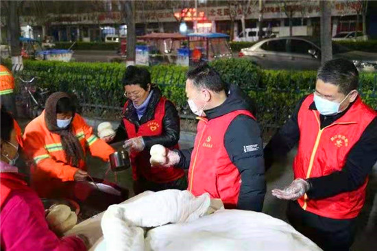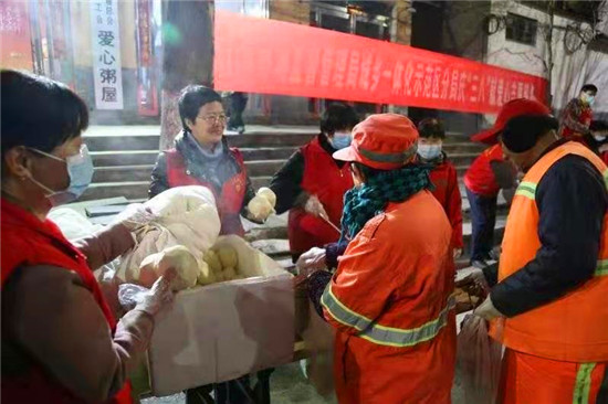 當(dāng)日早上5時,在愛心粥屋里,示范區(qū)分局的志愿者們穿著紅馬甲,戴上口罩,立即進(jìn)入忙碌狀態(tài),大家既分工明確又相互配合,現(xiàn)場井然有序。他們?yōu)榄h(huán)衛(wèi)工人盛飯端菜,拿雞蛋饅頭,動作迅速,熱情周到,有條不紊,個個忙得不亦樂乎。在這個清冷的早晨,因為有了熱氣騰騰的飯菜和志愿者忙碌的身影,環(huán)衛(wèi)工人開心地笑容,感受到濃濃暖意。