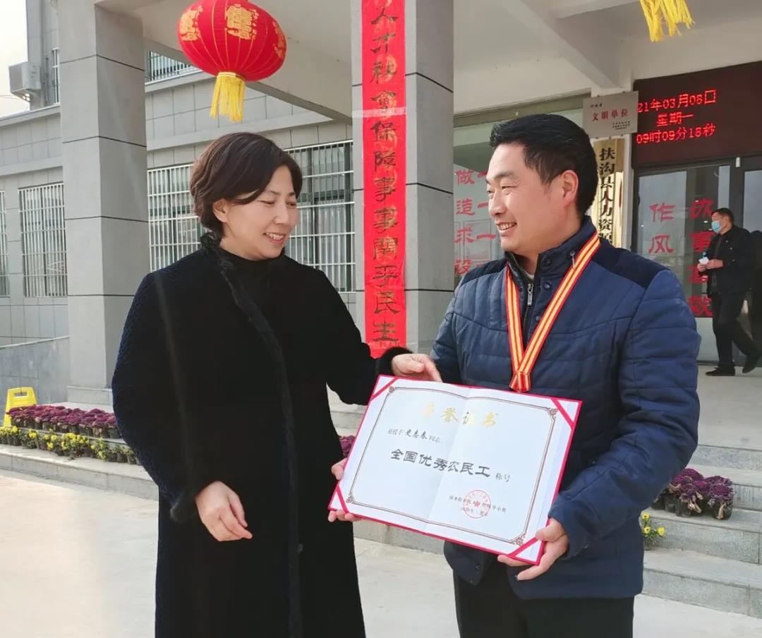 3月8日,在扶溝縣人社局辦事大廳門前,縣人社局黨組書記、局長(zhǎng)張艷玲將“全國(guó)優(yōu)秀農(nóng)民工”獎(jiǎng)?wù)?、榮譽(yù)證書、光榮冊(cè)送到河南省天驕樂器股份有限公司木工段段長(zhǎng)史志春手上,對(duì)其獲得“全國(guó)優(yōu)秀農(nóng)民工”榮譽(yù)稱號(hào)表示祝賀,勉勵(lì)他珍惜榮譽(yù)、再接再厲,以更優(yōu)異的成績(jī),為扶溝縣鄉(xiāng)村振興加油助力。②7