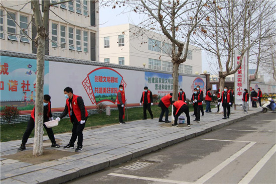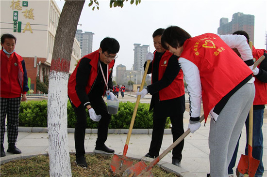另一邊,黨員教師則手拿滾刷,給校門口公園北路兩側的法桐樹刷上白灰、紅漆,宛若給樹穿了件新衣。伴隨著他們忙碌的身影,一排排法桐樹煥然一新,整齊的“紅白裙子”看上去格外漂亮。