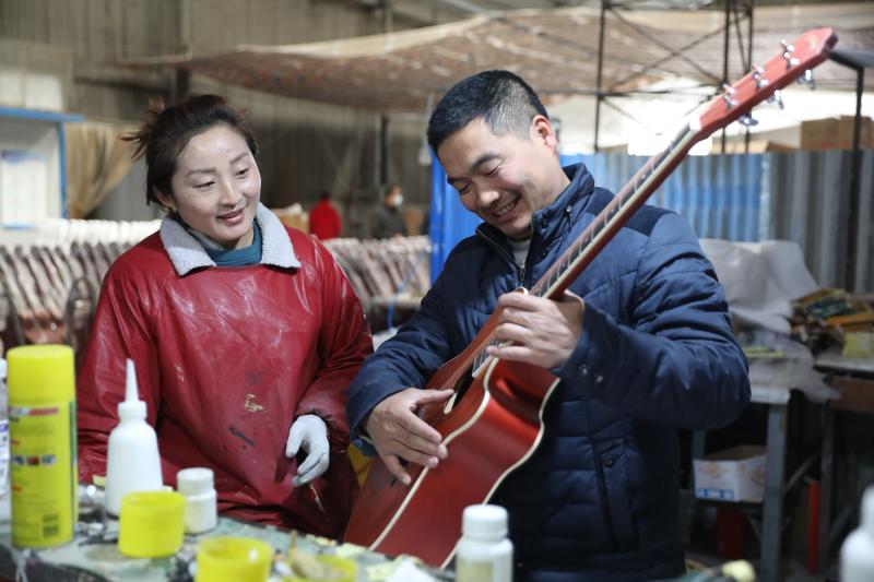 如今,天驕吉他總投資達(dá)500萬元,占地2萬平方米,建筑面積7000平方米,吸納農(nóng)民工60余人,每人年均收入達(dá)6-8萬,完全達(dá)到了異地高薪就業(yè)的標(biāo)準(zhǔn),同時帶動當(dāng)?shù)剡\(yùn)輸、餐飲等300余人實(shí)現(xiàn)就地就近就業(yè)。